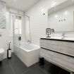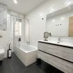 El baño, diseñado para tu comodidad, cuenta con una bañera perfecta para relajarte después de un día lleno de actividades. Su estilo funcional y elegante complementa el resto de la decoración del apartamento, brindándote un espacio donde desconectar y disfrutar de un momento de tranquilidad.