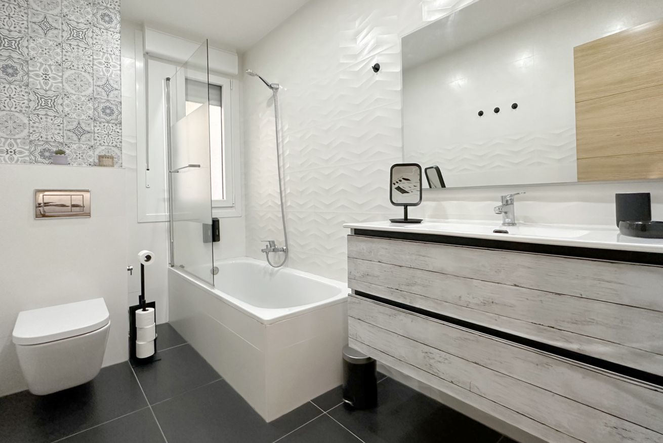 El baño, diseñado para tu comodidad, cuenta con una bañera perfecta para relajarte después de un día lleno de actividades. Su estilo funcional y elegante complementa el resto de la decoración del apartamento, brindándote un espacio donde desconectar y disfrutar de un momento de tranquilidad.